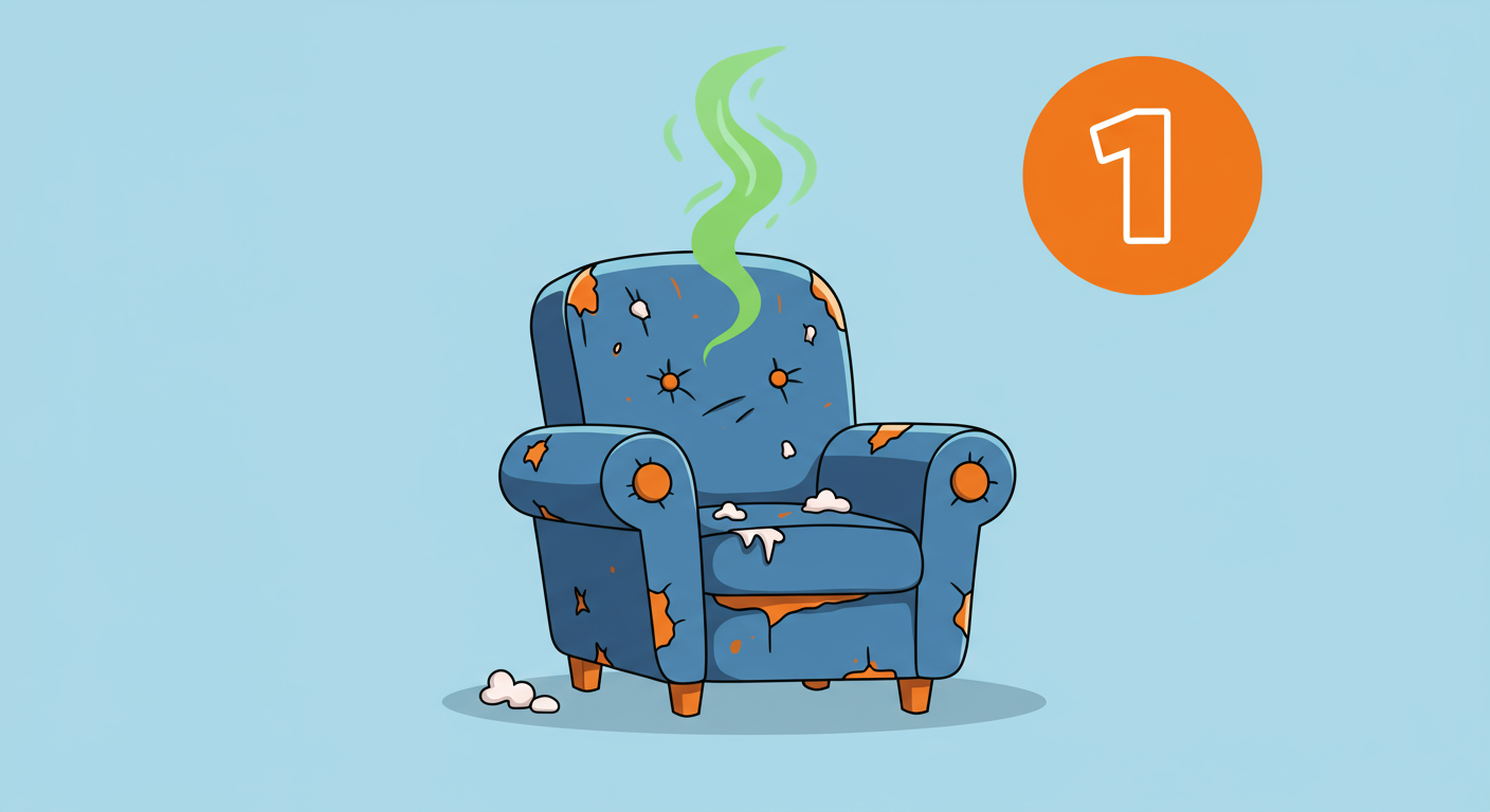 - Heavily used upholstered furniture. Saggy pillows and lumpy sofas are uncomfortable to sit on. And while they can be replaced, it can cost a lot to have done it professionally and will cost more trouble than they’re worth.