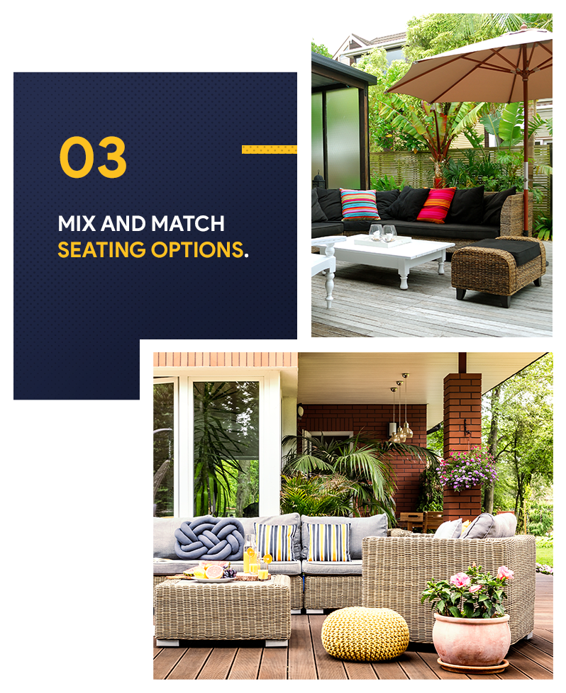 According to Zillow's 2019 Outdoor Living Trends, there's no need to rely on matching patio sets to upgrade your space. Instead, you can mix and match your seating options to achieve that curated, eclectic look that continues to gain popularity. Pull together benches, chairs, pint-sized stools, and ottoman for a unique look. You can even add floor pillows and poufs to create extra seating in your lounge area because, who doesn’t love that lovely Bohemian feel? You’ve got more choices than ever, and everything could potentially add some style to your patio. It’s also great if you love collecting individual pieces of furniture or if you just want a homey, vintage look. Just make sure to arrange the pieces and patterns in a way that they won’t look cluttered.