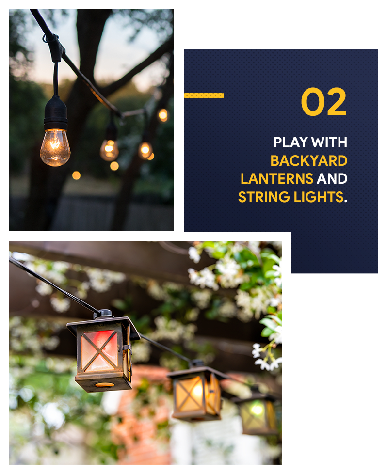 One way to embrace outdoor living and make your space an extension of your living room is to invest in additional lighting. Luminous decorations, such as floor or table lamps and lanterns, will not only brighten up your backyard but will also add interest to it. Just make sure to choose lamps that are designed for the outdoors and are weatherproof. Another brilliant idea is hanging pretty string lights across an entire space or along a fence to give your yard a rustic vibe.