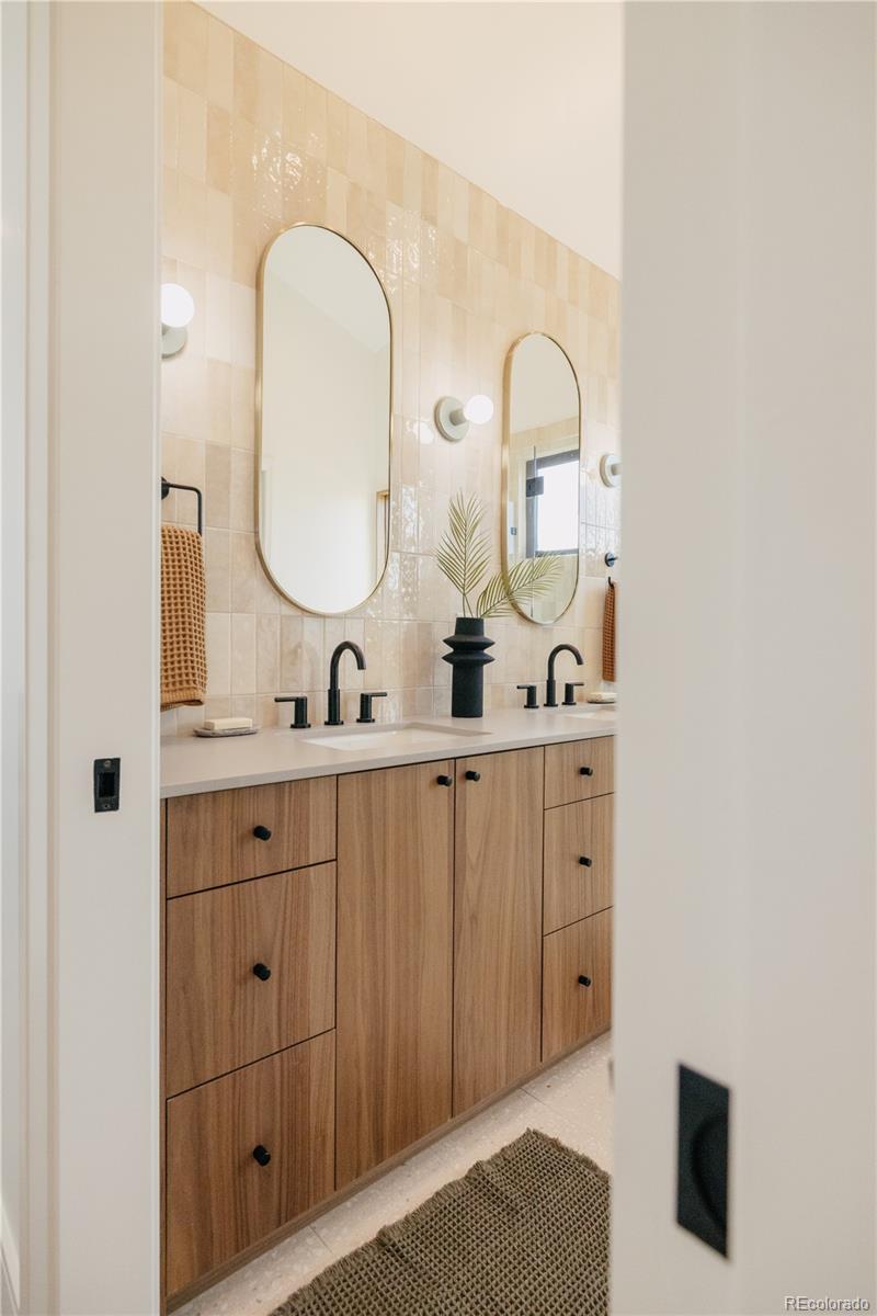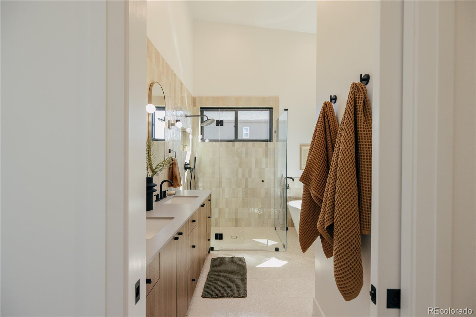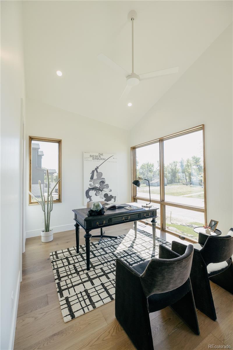 The spacious primary suite features large windows, a freestanding tub, and a curbless walk-in shower for a luxurious spa experience. A dedicated office with a private exterior entrance provides a quiet space for work or meetings, while the mudroom with custom lockers ensures convenient organization.