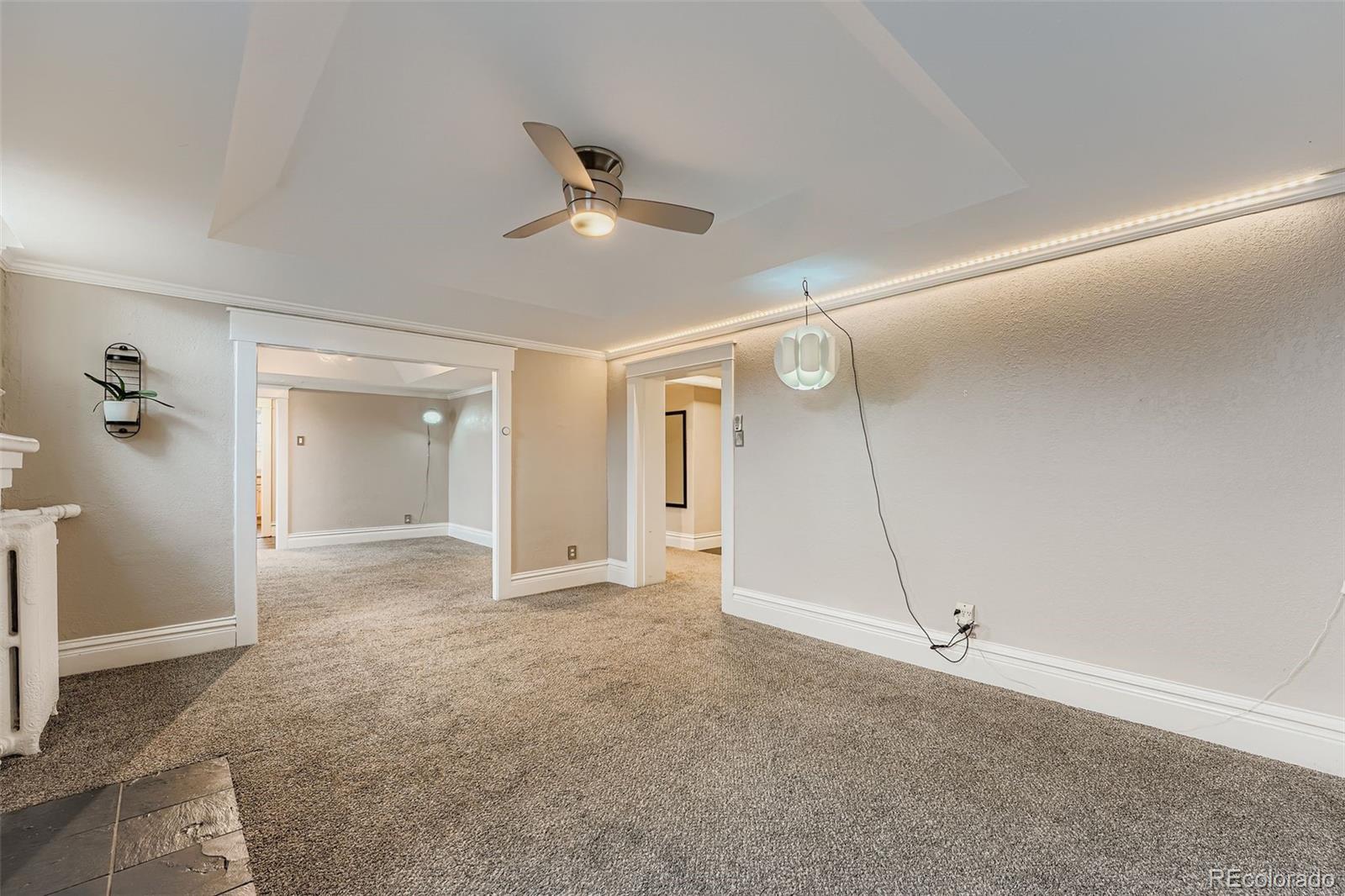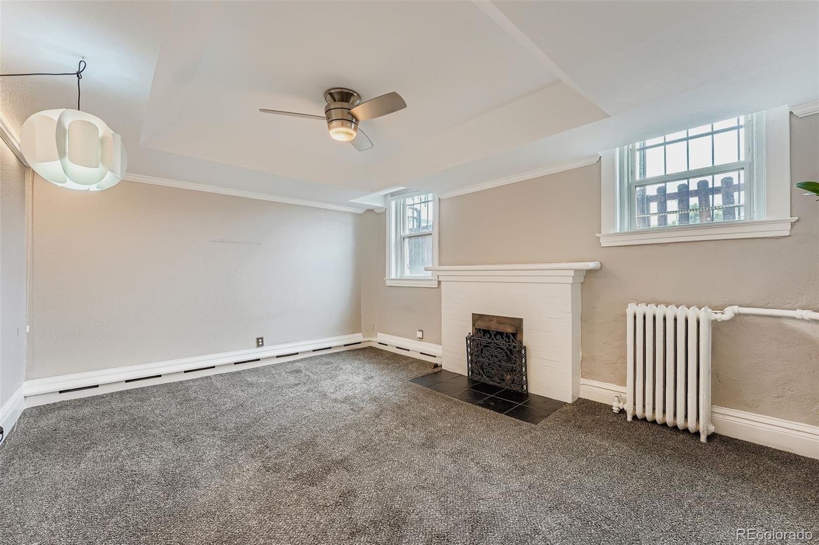 Dreaming of a quiet, peaceful retreat in the heart of the city? Look no further! This bright and spacious 2-bed, 1-bath condo in the heart of Capitol Hill has the best of all worlds. RARE CAPITOL HILL off-street assigned space private parking lot with an EV charger is included. Unmatched walkability (grocery stores, coffee shops, restaurants, parks, Denver Botanic Gardens), open and roomy living space, TONS of storage, and a wonderful community await. So many updates ... Complete bathroom remodel and update features tons of storage, and a beautiful walk-in shower. Closet Factory buildout in both bedrooms. Inserts in kitchen and pantry cabinets. All new window shades throughout the unit, blackout shades in bedrooms. All new carpet installed. This garden-level unit lives like an above-ground unit, and large south-facing windows provide abundant natural light. Rare backyard, incredibly quiet and private. The two roomy bedrooms are on opposite sides of the unit, making for a great roommate, home office, or guest room setup. Both bedrooms comfortably fit a queen-sized bed! The kitchen features a walk-through butler's pantry with plenty of cabinet space and a perfect coffee/tea/bar area. Gorgeous original built-ins in the dining room to display your favorite dishes and collectables. A beautiful original fireplace adds coziness and character to the living room. Free community laundry is conveniently right down the hall, as is the large extra storage room. This unit is truly a gem - don't wait, schedule a showing today!